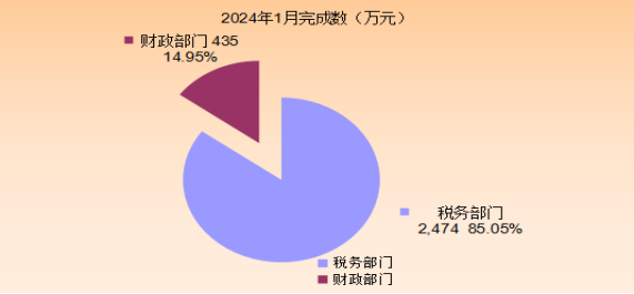 2024年1月,税务部门完成一般公共预算收入2,474万元,完成全年预算42,499万元的5.8%,比上年1,289万元增收1,185万元,增长91.9%;财政部门完成一般公共预算收入435万元,完成全年预算8,957万元的5.5%,比上年2,943万元减收2,508万元,下降85.2%。