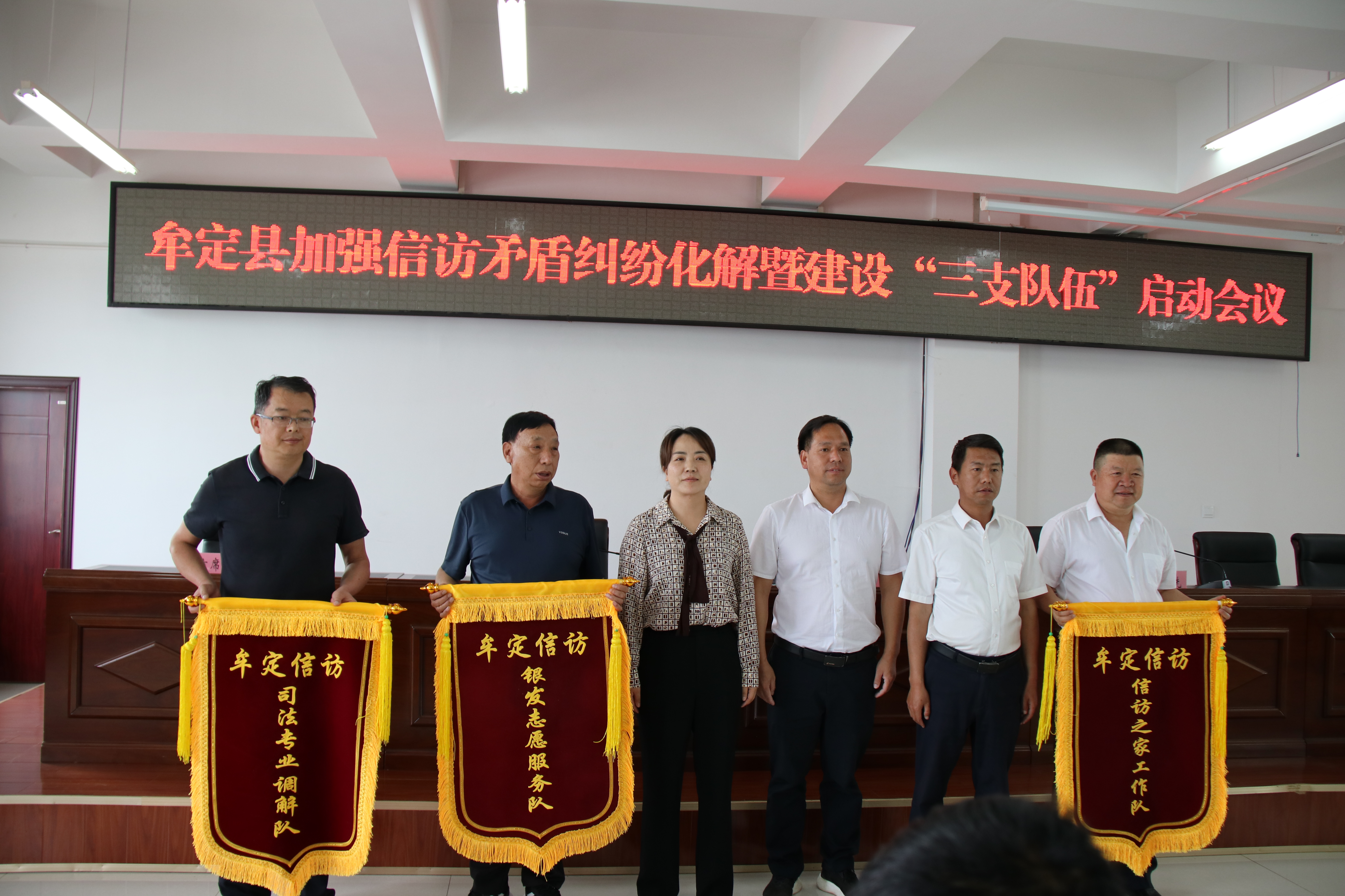 会议宣布了“司法专业调解队”“银发志愿服务队”“信访之家工作队”三支队伍的组成人员名单,与会领导为“三支队伍”授旗,“司法专业调解队”队长滕少顺同志代表“三支队伍”全体队员作表态发言。会议强调,建好“三支队伍”是深入推进信访工作法治化的必然要求,要坚持和发展新时代‘枫桥经验’,立足预防、调解、法治、基层,做到预防在前、调解优先、运用法治、就地解决群众合理合法诉求、维护群众合法权益,全面提升信访问题解决质效,推动信访事项办理法治化。建好“三支队伍”是把调解工作贯穿于信访工作全过程的必然要求,要持续加强信访问题源头治理和积案化解,深化“访调对接”机制建设,统筹融合各方资源,以信访矛盾化解为抓手,不断拓展延伸社会力量参与信访工作的制度化渠道,实现“访调对接、公调对接、诉调对接”无缝衔接。