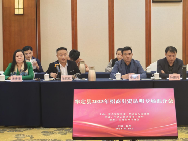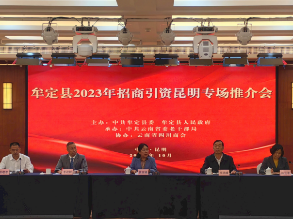2023年10月20日,经云南省委老干部局牵线搭桥,牟定县主办、云南省四川商会协办的牟定县2023年招商引资专场推介会在昆明举行,省委组织部副部长、省委老干部局局长袁丽娟,副局长陈云平,省投资促进局二级调研员彭敬忠,牟定县委书记李明峰率县党政招商团与云南省四川商会25家会员企业参加了活动。