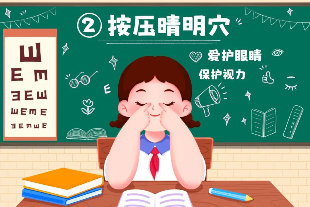 在持续用眼后认真规范做眼保健操,可以让眼睛得到充分的休息,减少调节滞后,改善视疲劳症状,有助于防控近视。做操时应注意清洁双手,找准穴位,力度到位,以略有酸胀感为宜。
