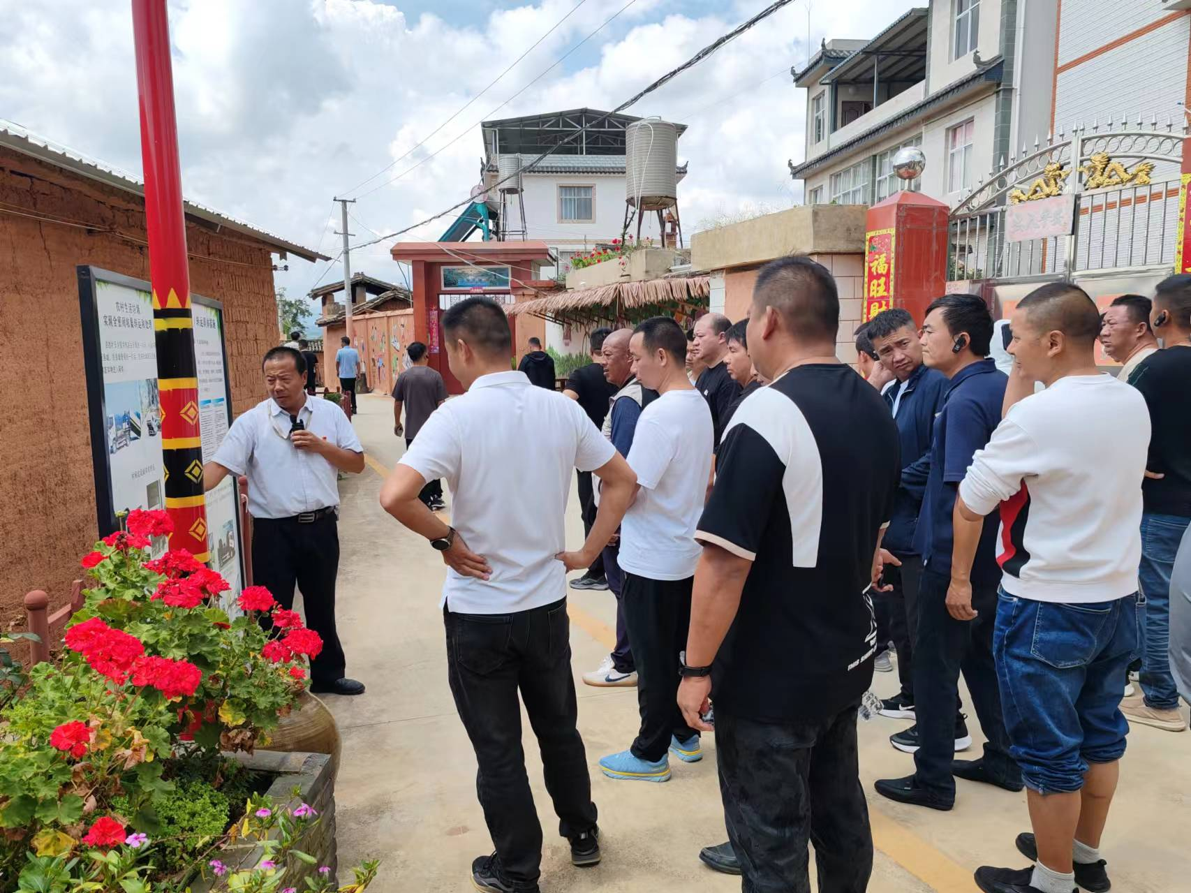 随后,学员们走进江坡村委会大村,村庄干净整洁,小道两旁鲜花盛开,一处处村美人和、宜居宜业的美丽村庄跃然眼前。村党总支书记、村委会主任王加新向大家分享了农村环境整治经验,作为国家级传统村落,面对群众保护意识不强,脏乱差现象突出等问题,村党总支充分发挥战斗堡垒作用,创新运用“十户一体两清单”工作模式,坚持“多一点自主建设、少一点对外承包,多一点就地取材、少一点花钱购买,多一点乡土气息、少一点城市味道,多一点文明新风、少一点陈规陋习”的“四多四少”原则,积极组织干部群众参与,持续开展村庄美化行动。同时,充分发挥红色文化资源,整合美丽乡村建设、农村环境整治、平安建设、清廉村居等项目资金,建设了初心路、清廉路、传承巷、平安巷等主题鲜明、受众度高的村间小道,村庄面貌发生了翻天覆地的变化。
