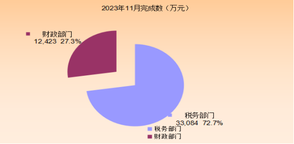 2023年1-11月税务部门完成一般公共预算收入33,084万元,为县人民代表大会批准全县全年预算40,542万元的81.6%,比上年同期31,362万元增收1,722万元,增长5.5%;财政部门完成一般公共预算收入12,423万元,为县人民代表大会批准全县全年预算6,366万元的195.1%,比上年同期10,824万元增收1,599万元,增长14.8%。