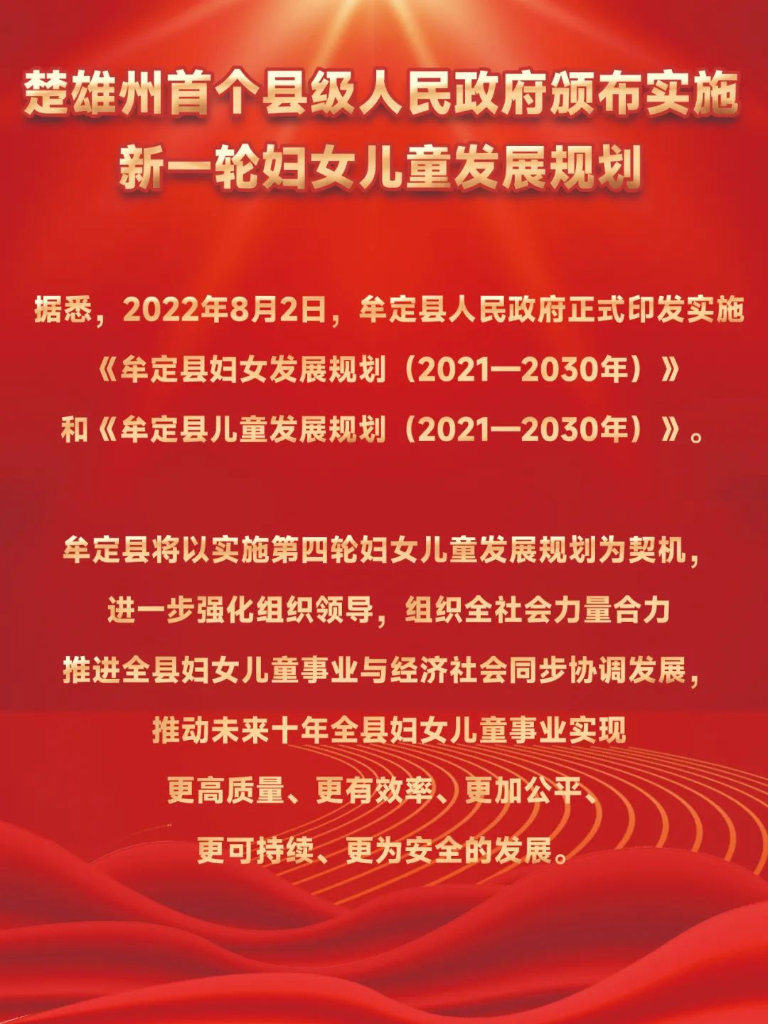 日前,《牟定县妇女发展规划(2021-2030年)》《牟定县儿童发展规划(2021-2030年)》已经十八届县人民政府第8次常务会议、十四届县委第28次常委会会议审议通过,并于8月2日颁布实施。