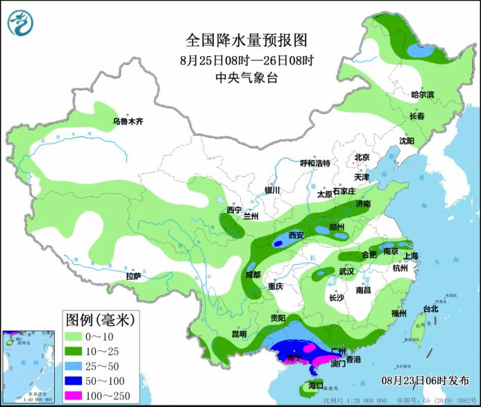 降雨预报:预计25日至26日,广东西部和南部、广西、云南东部等地有大到暴雨,广东中南部、广西东部等地部分地区有大暴雨,局地累计降雨量有250~300毫米。其中25日,广东西部、广西大部有大到暴雨,部分地区大暴雨(100~200毫米,见图3)。