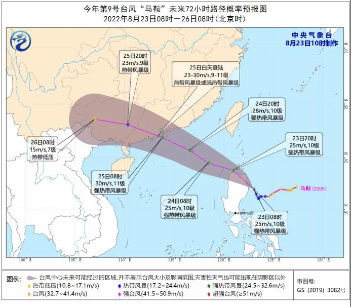 大风预报:预计23日至26日,巴士海峡、台湾以东洋面、台湾海峡、南海北部、台湾沿海、广东沿海将先后出现6~8级大风,巴士海峡、南海北部部分海域将有9~10级大风,台风中心经过的附近海面和地区的风力可达10~11级,阵风12~13级。