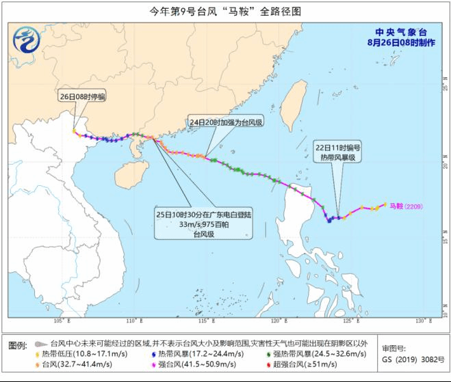 第9号台风“马鞍”于8月22日11时在菲律宾吕宋岛以东洋面生成,23日08时加强为强热带风暴级,当天夜间移入南海;24日20时在南海东北部海面加强为台风级;25日10时30分在广东电白沿海登 陆(台风级,12级,33米/秒),登 陆后向偏西方向移动,25日15时以强热带风暴级进入广西境内,傍晚移入北部湾北部海面,22时前后再次在越南广宁省沿海登 陆(热带风暴级,8级,20米/秒,见图1)。26日5时“马鞍”在越南太原省境内减弱为热带低压,8时中央气象台对其停止编号。
