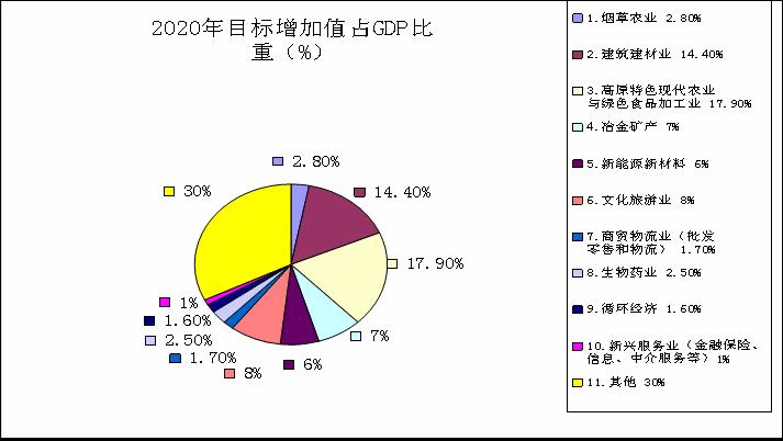 全县GDP由“十一五”末的18.2亿元增长到“十二五”末的38.1亿元,增加19.9亿元,年均增长12.6%,高于“十二五”规划目标0.6个百分点,经济总量在“十一五”基础上实现了翻番,区域综合实力跃上了新的台阶。三次产业结构调整为28.6:33.2:38.2,全县集中力量建设烟草农业、冶金矿产、建筑建材、绿色食品、文化旅游产、新能源新材料六大重点产业,同时加快发展新兴产业,重点产业建设加快推进。