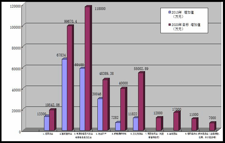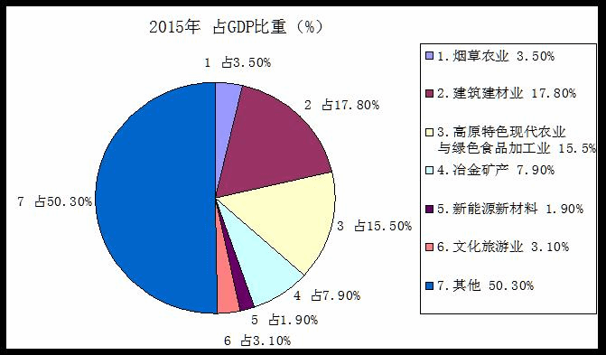 到2015年,六大重点产业实现增加值189384万元,同比增长13.9%,占全县GDP比重49.7%。其中:烟草农业实现增加值13300万元,同比增长6.3%,占GDP比重3.5%;冶金矿产业实现增加值30046万元,同比增长7.3%,占GDP比重7.9%;建筑建材业实现增加值67834万元,同比增长19.2%,占GDP比重17.8%;绿色食品业实现增加值59100万元,同比增长11.1%,占GDP比重15.5%;文化旅游产业实现增加值11822万元,同比增长17.7%,占GDP比重3.1%;新能源新材料业实现增加值7282万元,同比增长35.1%,占GDP比重1.9%,对全县经济社会发展的支撑力明显增强。(见表一及附图)