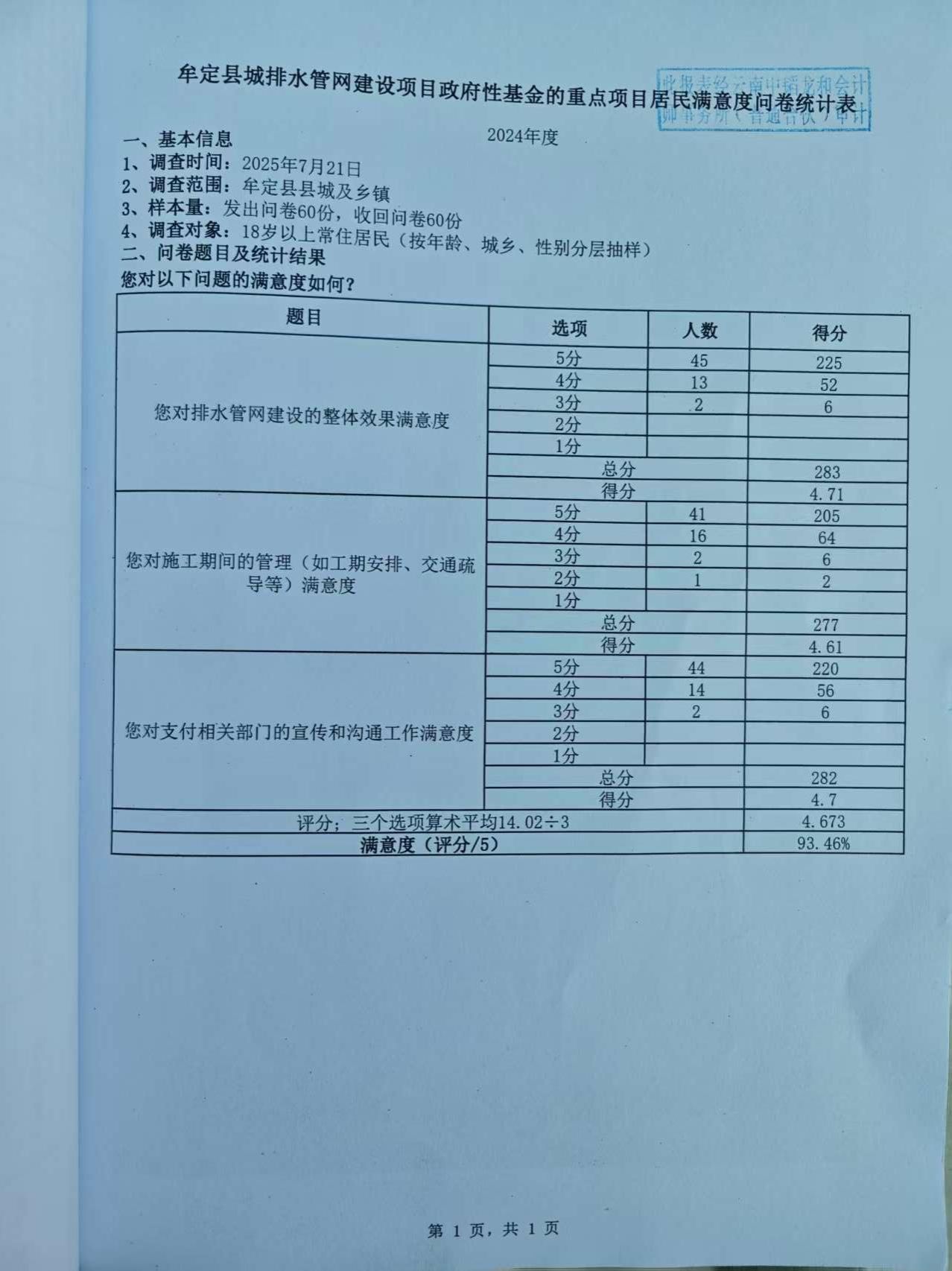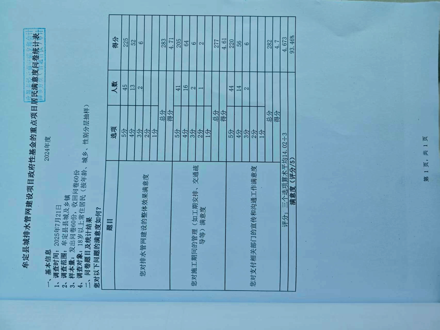 3.居民满意度:评估项目覆盖区域内居民对排水管网建设效果的主观感受和认可程度,综合反映项目的社会效益。从最终用户角度验证项目实施成效,确保专项债券资金投资切实改善民生,提升群众获得感。周边居 民满意度≥95%得5分,每低5%扣1分。