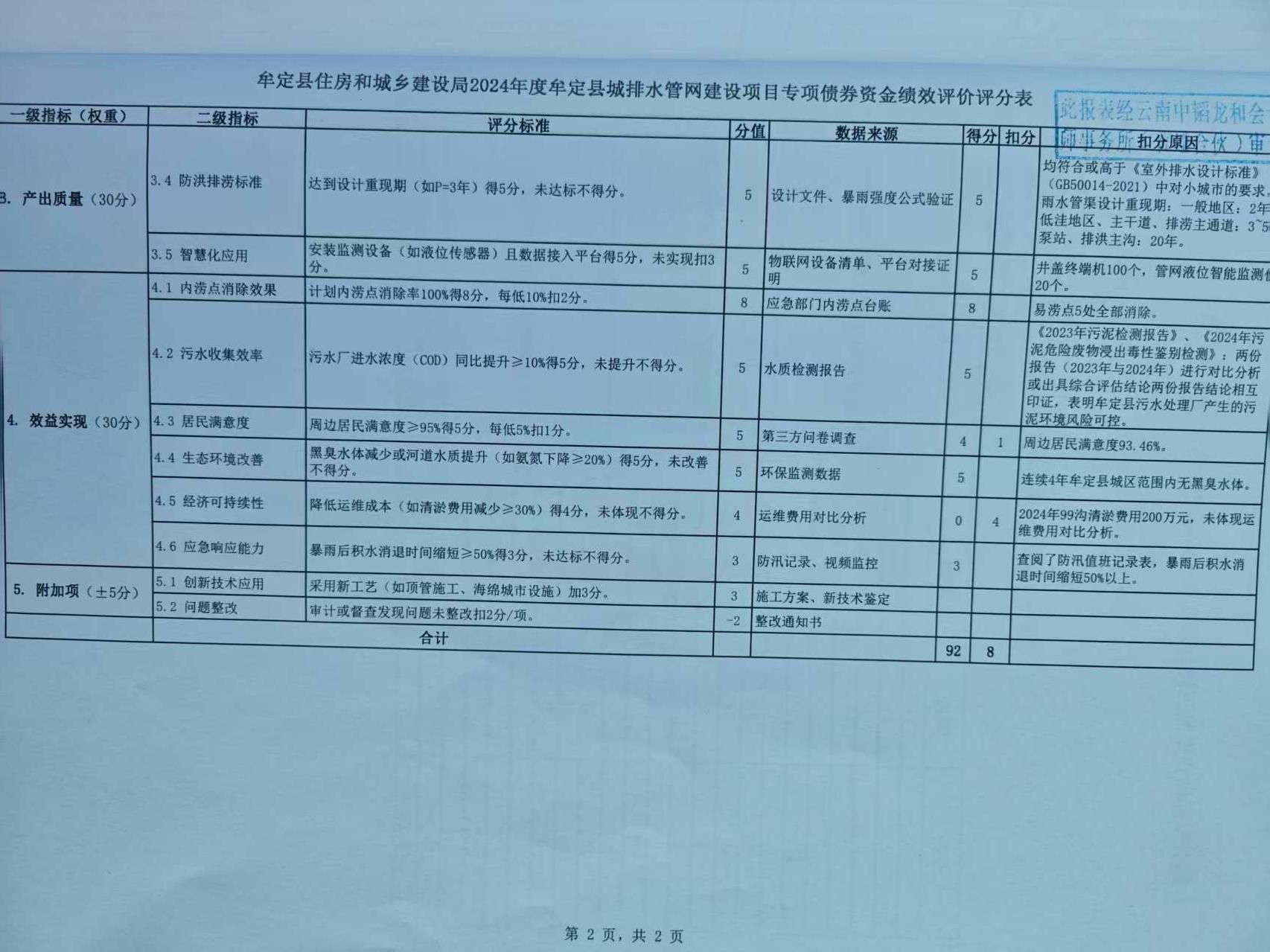 1.内涝点消除效果:评估项目实施后对历史内涝点的治理成效,反映排水系统实际改善程度。验证专项债券资金投入的直接效益,确保重点区域防洪排涝能力显著提升,保障城市安全运行。计划内涝点消除率100%得8分,每低10%扣2分。
