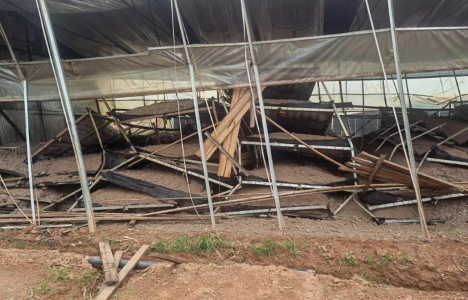 事故发生地点位于牟定县共和镇散花村委会邓光屯冷家村民小组楚雄福林田农业科技发展有限公司姬松茸种植基地。该种植基地约35亩,地面建有种植大棚30个,每个大棚内有10个左右角钢构件菌菇架。经现场查看,4号大棚已坍塌倾斜,大棚内菌菇钢架已基本坍塌变形,现场一片狼藉(事故救援导致),菌菇架上的菌种、生产辅料等散落地面。经勘查,大棚内坍塌菌菇架共10个,全部采用角钢网格式焊接,每个菌菇架共六层,高度约3.5-3.6米,测量立柱角钢规格为30*30MM,横杆规格为40*40MM。