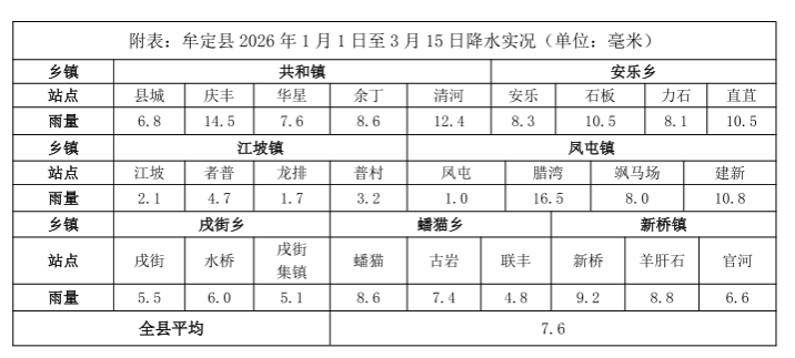 2026年1月1日 ~3月15日,县城累积降水量为6.8毫米,比历年同期偏少23.8毫米,比去年同期偏少6.2毫米。平均气温12.0℃,比去年同期偏高0.5℃,比历年同期偏高0.9℃。