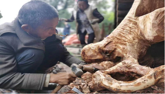 (牟定县共和镇稗子田村村民自己动手雕刻彝族特色小摆件,打造美丽村庄。卢敏摄)