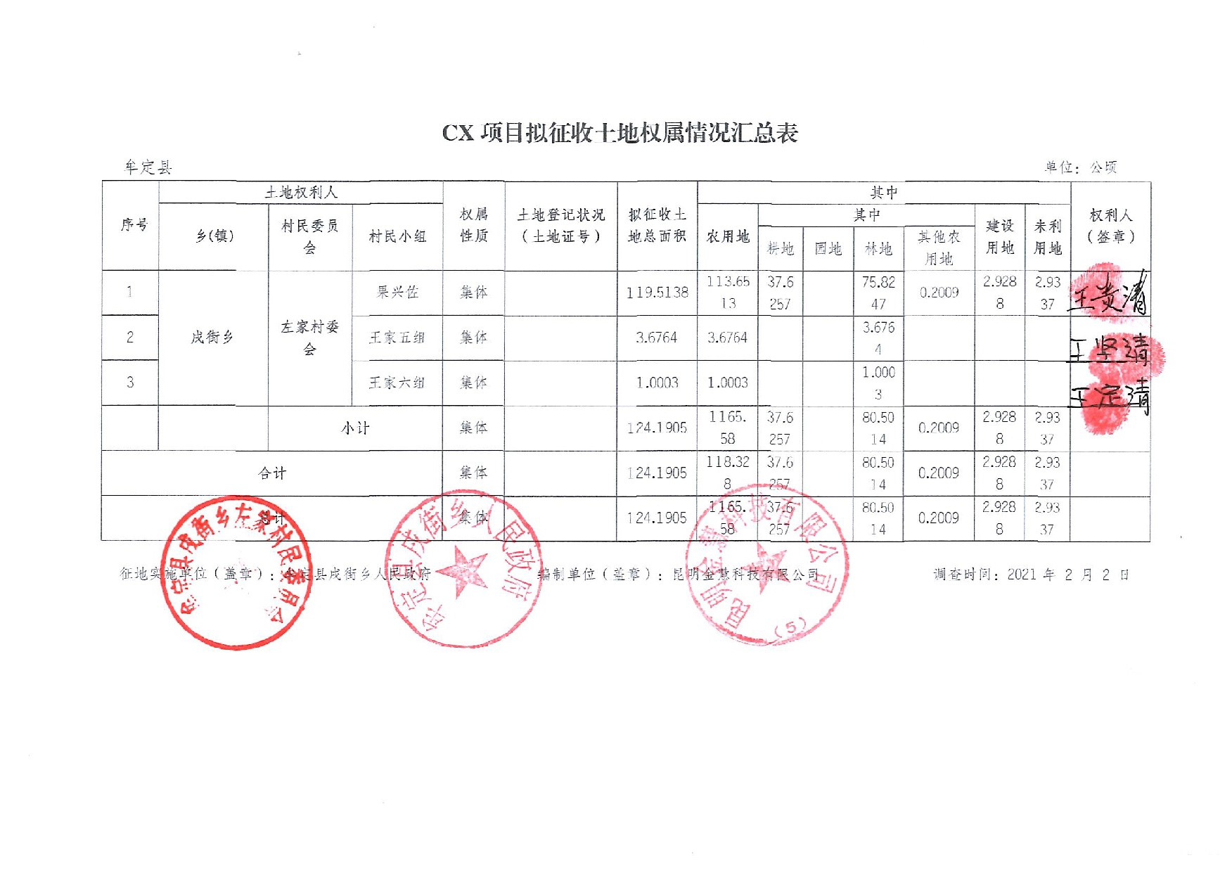 本项目拟征收牟定县戌街乡左家村民委员会果兴佐村集体土地。土地总面积119.5138公顷,农用地116.585公顷(耕地37.6257公顷,其中水田12.9542公顷、旱地23.0139、水浇地1.6576公顷;林地75.8247公顷;其他农用地3.1346公顷),建设用地2.9288公顷。戌街乡左家村民委员会王家五组村集体土地。土地总面积3.6764公顷,农用地3.6764公顷(林地3.6764公顷)。戌街乡左家村民委员会王家六组村集体土地。土地总面积1.0003公顷,农用地1.0003公顷(林地1.0003公顷)。安乐乡石板村民委员会小石板村集体土地。土地总面积0.0075公顷,农用地0.0075公顷(耕地0.0027公顷,其中旱地0.0027公顷;林地0.0048公顷)。安乐乡桃园村民委员会刘家坝村集体土地。土地总面积0.1232公顷,农用地0.1232公顷(耕地0.1232公顷,旱地0.1232公顷)。共和镇散花村民委员会罗旗屯村集体土地。土地总面积0.1534公顷,农用地0.1534公顷(园地0.1266公顷,果园0.1266公顷;其他农用地0.0268公顷),详见《CX项目拟征收土地现状调查报告》。
