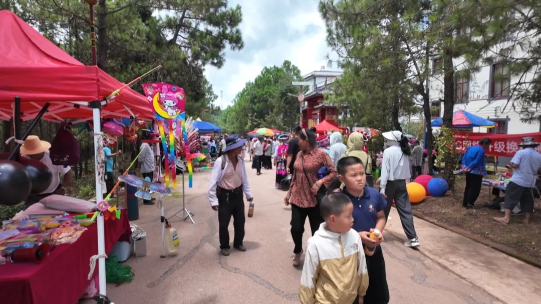 集市上,摊位沿着山路依次排开,各类商品琳琅满目,令人目不暇接。这边,圆润饱满的葡萄、红彤彤的苹果、细腻多汁的云南红梨,吸引着过往的人群驻足挑选;那边,摆放整齐的手工竹篮、精致的木雕摆件,展示着当地工匠们的精湛技艺,引得游客们纷纷询价购买。精美的彝族服饰也成为游客们驻足的打卡点。美食区弥漫着浓郁的香气,各种传统小吃应有尽有,刚出锅的油炸洋芋,放上调料香辣爽口;热气腾腾的粉蒸羊肉和羊汤锅,香飘四溢,成为当天集市上最畅销的美食。摊主们热情地招呼着顾客,食客们围坐在简易桌椅旁,一边品尝美食,一边欣赏彝家欢快的左脚舞,整个山间回荡着欢声笑语。“我每年都来赶这个立秋会,今年又换了一个地点到化佛彝村来赶这个秋会,到这个山林间逛集市,感觉空气相当好。”一名赶会的游客说。