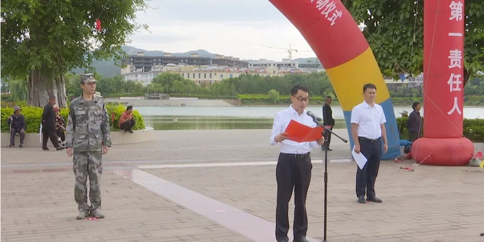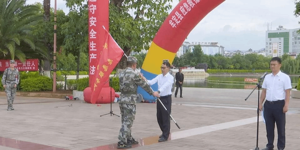6月17日,牟定县在化湖广场举行应急救援突击队、退役军人志愿服务队、机关民兵应急排成立授旗仪式暨2022年“安全生产月”活动启动仪式。