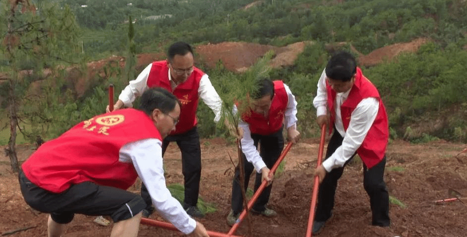 在金马社区朱家山一组房后假戈山,参与植树的县领导与新时代文明实践志愿者挥锹挖塘、植苗正苗、填土固根……经过一番紧张有序的劳作,1000多株新栽下的湿加松树苗迎风挺立、生机勃勃,为大地增添了绿意。