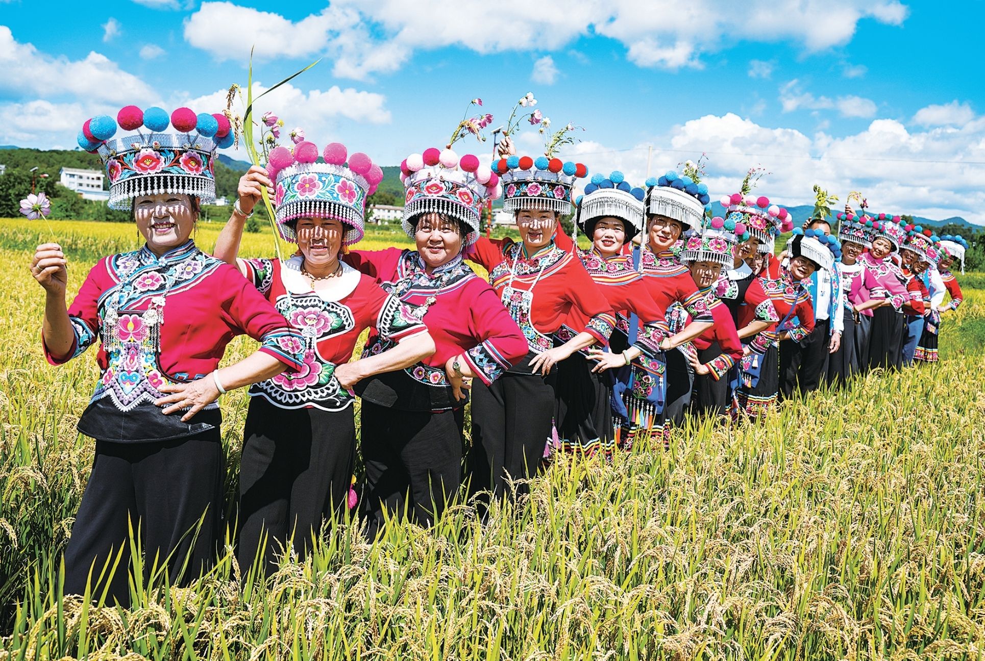 何梁村委会别出心裁地将庆丰收的舞台搬到了田间地头。当欢快的《歌唱丰收年》《何梁门前稻谷黄》《庆丰收棕棕棕》《丰收年》左脚舞音乐响起,整个田野都沸腾了。20多名村民身着色彩鲜艳的彝族服饰,每个人的笑容都映照着金黄的稻谷,大家手拉手,在机耕路上跳起了欢快的左脚舞,奏响着一曲曲丰收曲。何梁村文艺队副队长、左脚舞队队长徐花芳在昆明打工,听说要在家门口的稻田里举办庆丰收活动,便赶回来带领队员们积极参与,表演了《丰收之歌》《丰收圆舞曲》等节目。