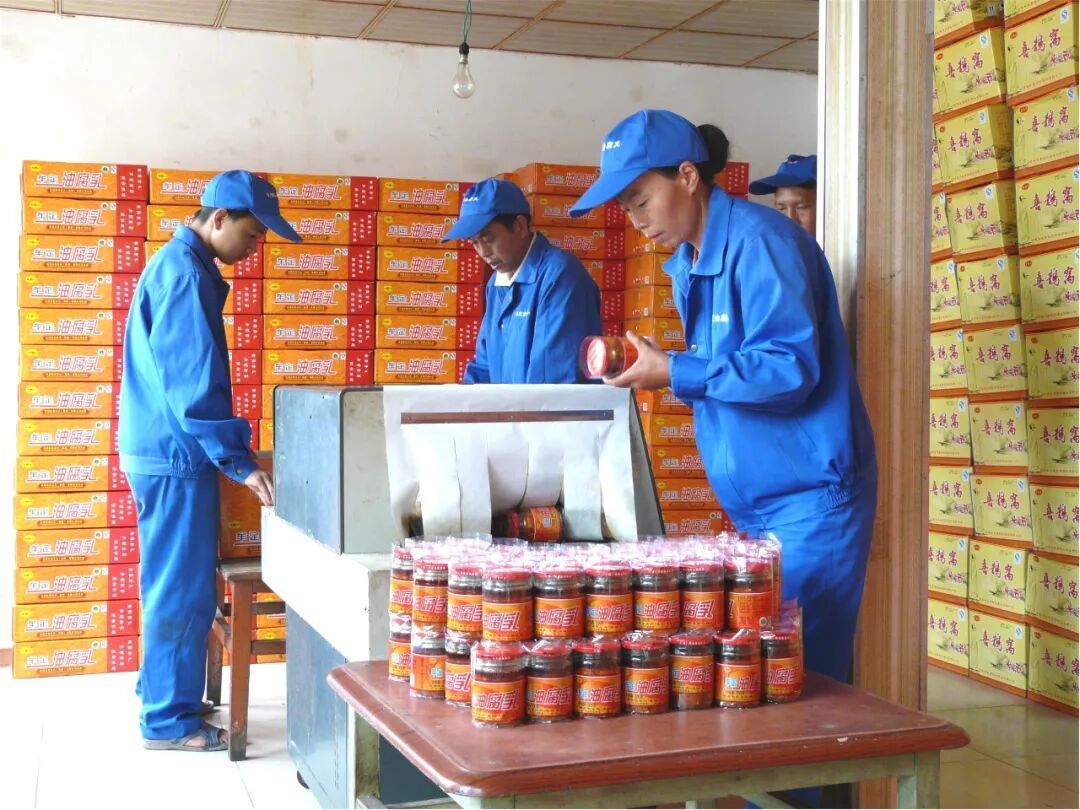 推动产业转型。围绕“一镇一园一街”思路,编制“牟定腐乳”产业体系规划,有效推动现有产业结构调整,在保护生物多样性、改善生活条件、实现生态平衡等方面成效显著,对民俗文化保护等起到积极作用,实现产业发展与生态保护良性互动。全面推动企业提质扩能,支持腐乳企业实施技改扩建,改进生产、装瓶、包装等关键环节工艺,推动生产向机械化、规模化转型,提升产业基础能力。结合“一乡一特”“一村一品”建设推动原材料种植专业化、基地化,扶持省级农业龙头企业7家、州级农业龙头企业6家、专业合作社7家,积极协助重点企业申报云南省知识产权优势企业,助力企业增强核心竞争力。强化源头绿色管控,加快大豆、油菜等原辅料绿色有机认证基地及优质粮油生产基地建设,辐射带动3万余农户种植黄豆、油菜、辣椒、花椒等原料10万亩。严格企业绿色监管,推动2个产品获绿色食品认证,建成省级数字农业基地1个。12家腐乳企业的28个腐乳品牌通过国家绿色食品认证,多家企业获“中国绿色食品认证”。