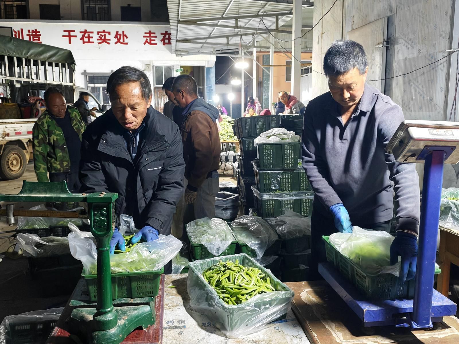 村民在给分拣好的荷兰豆过秤