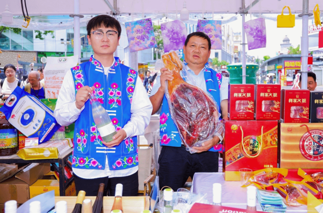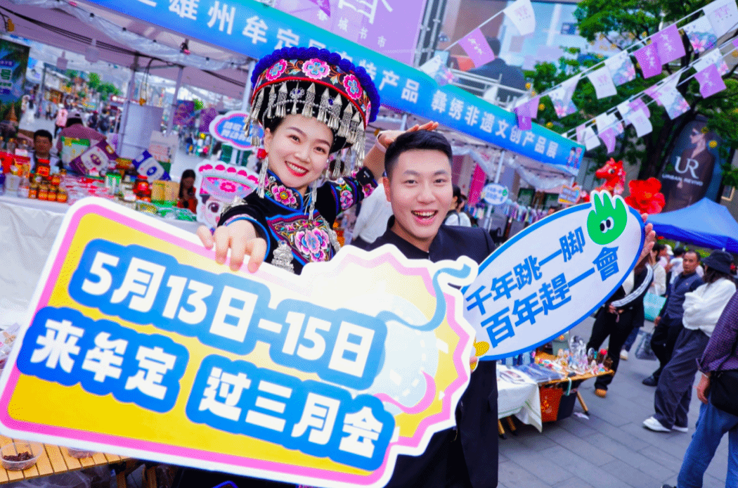 当天的南屏街广场仿佛一个小型牟定集市,牟定县农特产品、彝绣非遗文创产品展位一字排开,彝绣传承人现场展示针法,牟定腐乳开坛飘香,火腿、猪干巴切成薄片供人试吃,葛根系列产品、云香绿宝精油和护肤品也一一亮相。这些只是“先遣队”,更多牟定特色好物将在“三月会”期间集中展销。