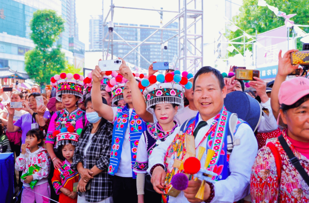 活动现场还举行了非遗时装走秀,彝绣元素与现代设计巧妙融合,让千年非遗在昆明街头绽放时尚光彩。牟定文旅知识问答和互动抽奖环节气氛热烈,现场市民和游客踊跃参与,幸运观众获得牟定腐乳、彝绣文创等特色好礼。