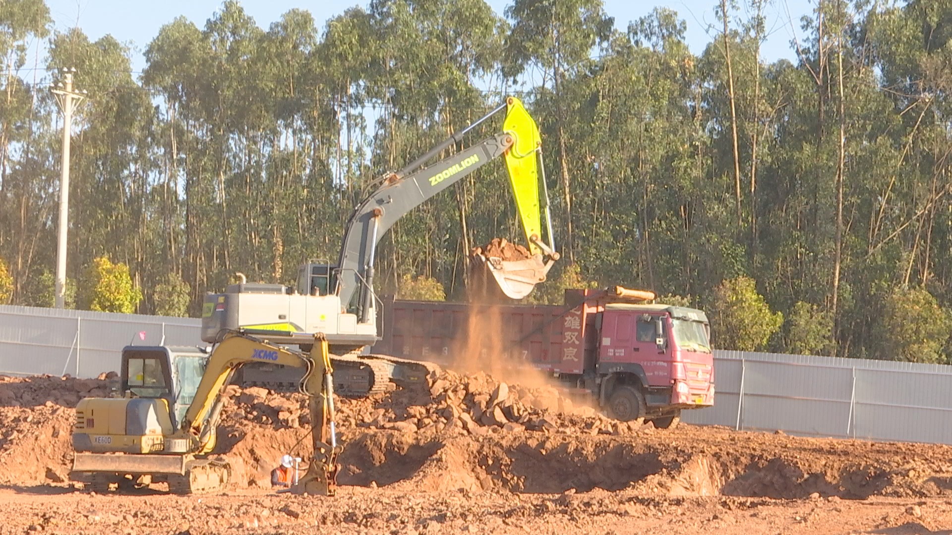 在牟定县6000吨桉叶油精深加工循环发展项目施工现场,可以看到主体基坑开挖已经完成,4台挖掘机正在进行渣土外运作业。