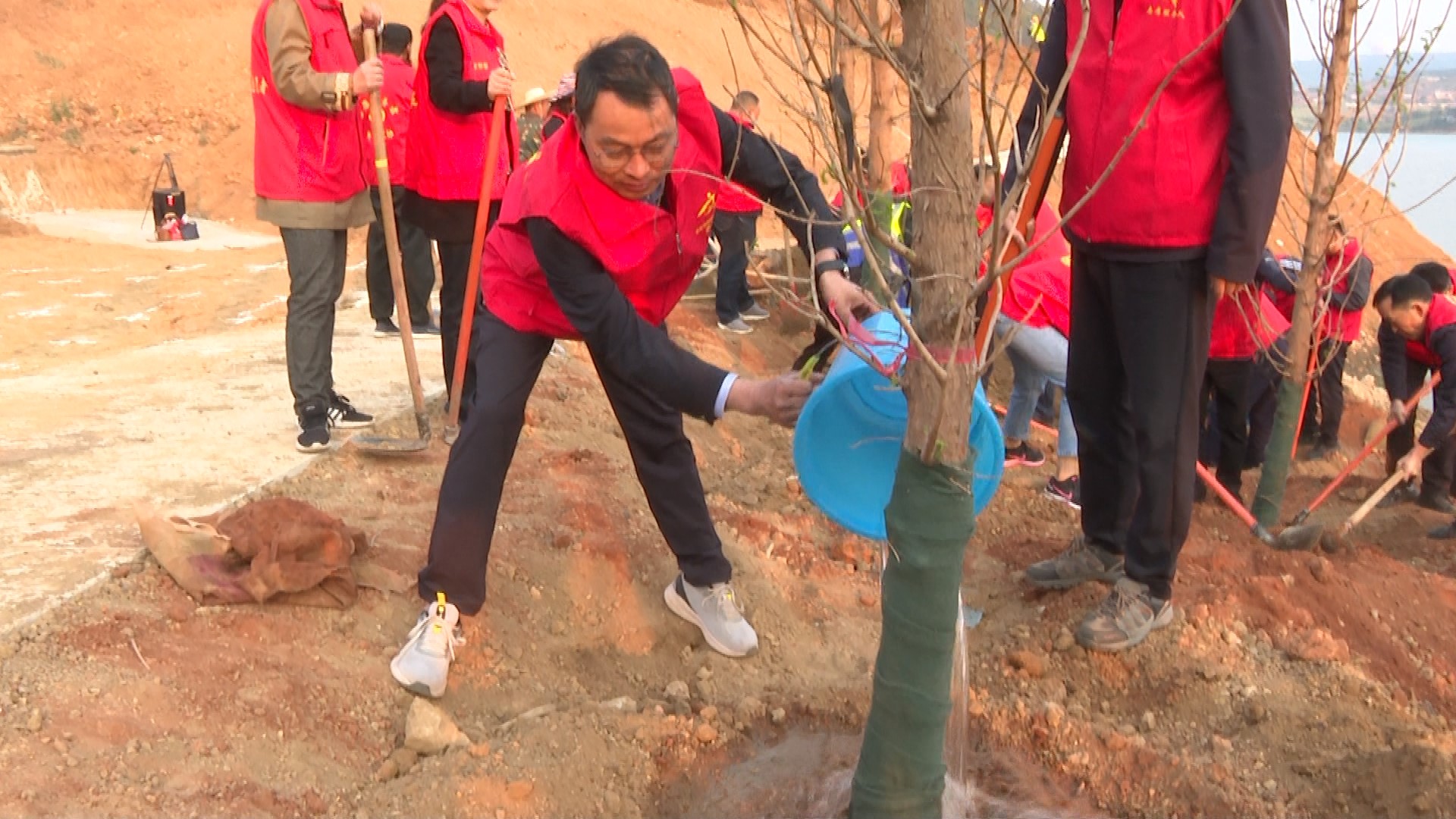 植树现场,县委书记李明峰,县委副书记、县长李永军带头挥起锄头培土植树,大家几人一组,放苗扶树、挥锹填土、夯土固苗、提水浇灌……在这场富有意义的植树活动中,60余株新种下的水杉树迎风挺立,传递着春的生机与活力,为庆丰湖畔增添了一道靓丽的风景线。