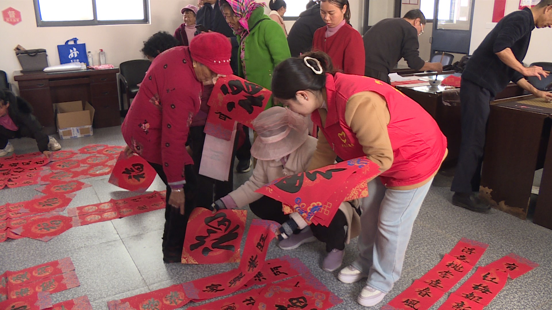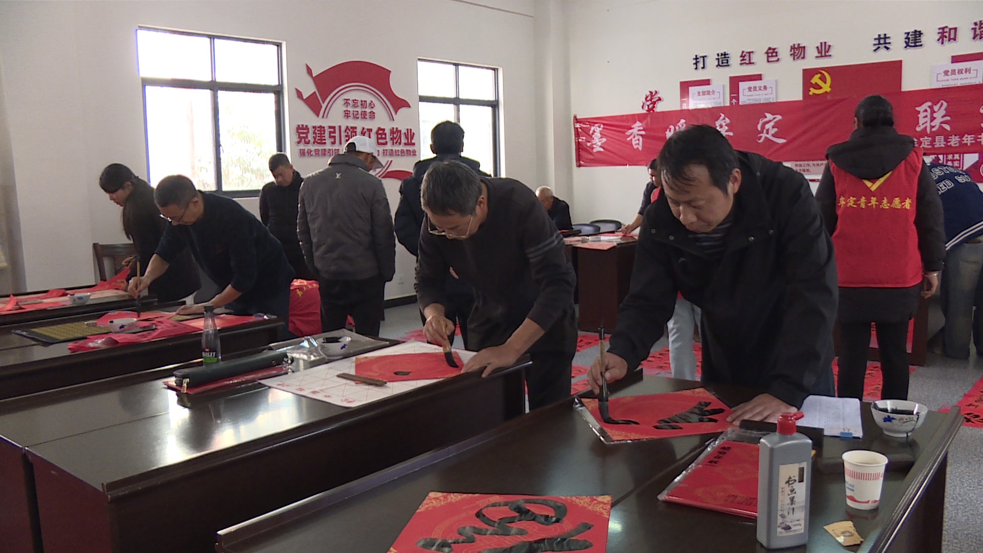 活动现场热闹非凡,牟定县书法家协会会员及书法爱好者饱蘸浓墨,笔锋游走间,一副副对仗工整、寓意吉祥的春联被流畅写成。春联字迹刚劲有力,一撇一捺都蕴含着对新春的美好期盼和祝愿。平屯社区的志愿者们分工协作,整理好春联,为行动不便的老人送“福”上门。