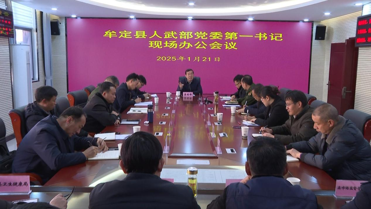 牟定县人武部党委第一书记现场办公会议1月21日上午召开。会议强调,要深入学习贯彻习近平强军思想,确保牟定县党管武装工作平稳开局,不断推动国防动员和后备力量建设取得新成效。