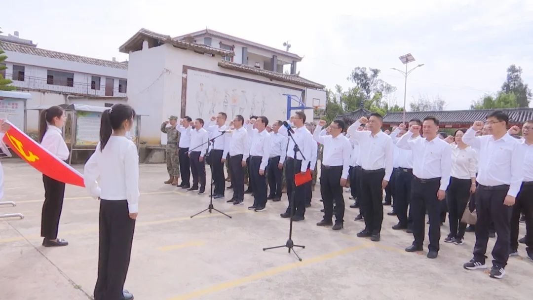 在红六军团长征过牟定指挥部旧址——三清阁前,县委常委班子整齐列队,在讲解员的深情讲述中,重温红军将士突破重围、发动群众、播撒革命火种的壮举,深刻体会红军的严明纪律和军民鱼水深情。随后,县委常委班子沿着当年红军长征过牟定时的足迹,徒步周家、吴家、三层楼、梁官屯、何屯、施大路村,感受红军长征的艰辛与伟大,激发不畏艰难、勇往直前的奋进力量。在施大路村文化室广场,县委书记李明峰领誓,大家面对党旗重温入党誓词,激励全体党员干部铭记初心使命,强化党性锤炼,深化政治忠诚,以实际行动传承光荣传统和优良作风。