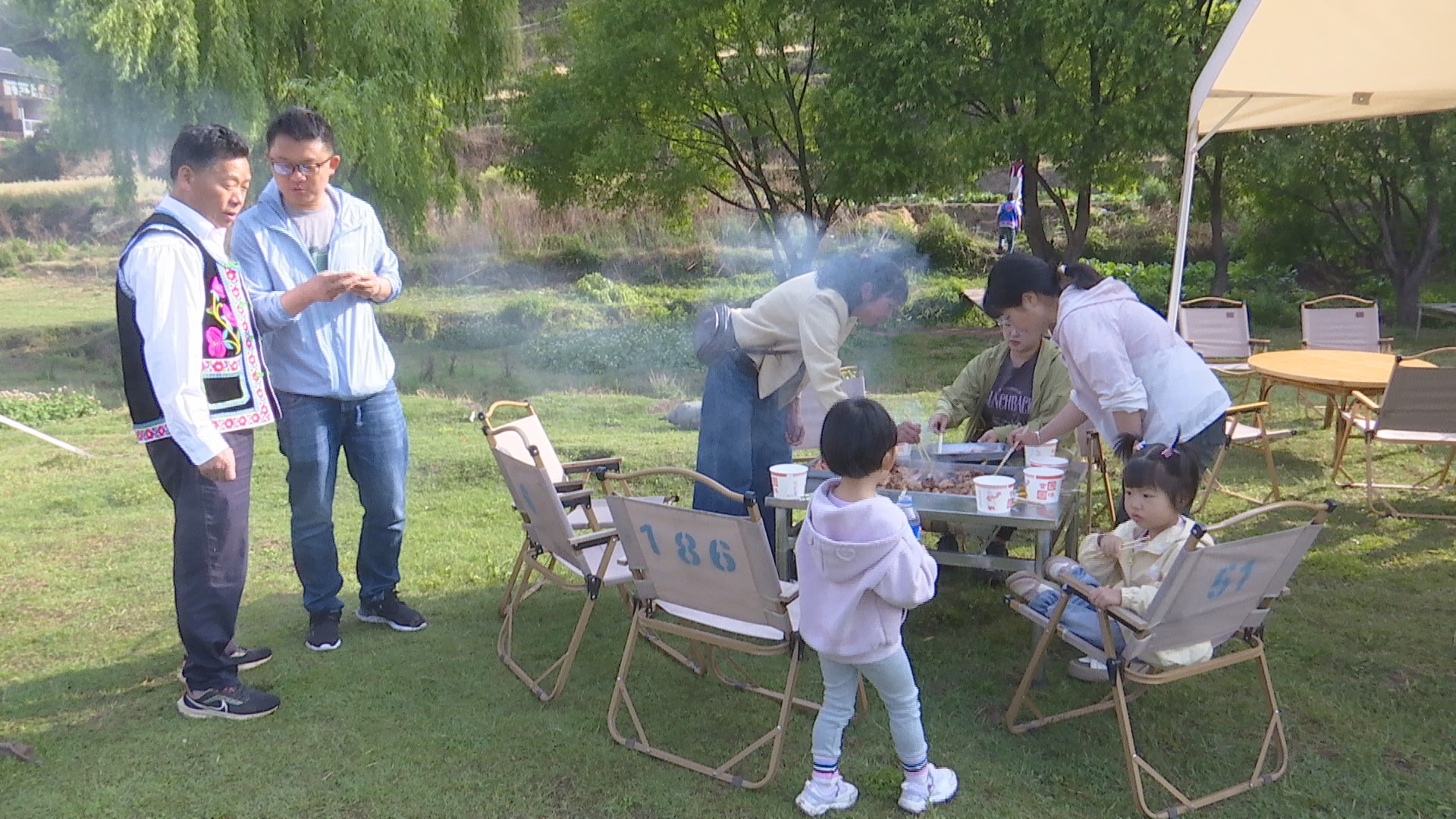 来露营烧烤的游客也悠闲地品尝着自己烤制的佳肴美味,享受着绿水青山带来的舒适与愉悦。“和家人朋友一起来感受一下‘三月会’的热闹氛围,一起吃烧烤,玩的很放松、很惬意、很开心。”游客宿鸾一家也玩的很开心。