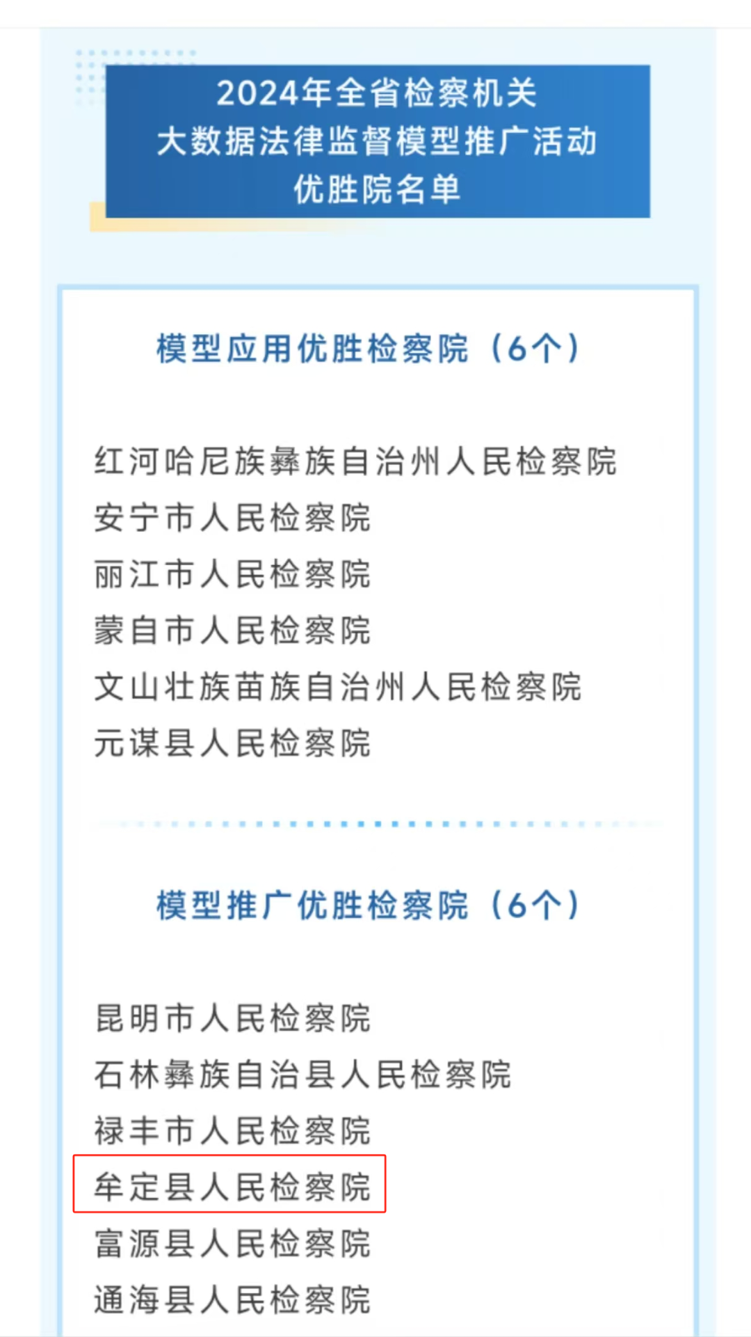 以“应用牵引、实战导向”为原则,积极运用最高检大数据监督平台上架推广运用模型,发现线索40余条,成案35件。有效探索实践通过技术赋能破解传统监督瓶颈,同时注重从“研发”到“应用”的全链条服务,推动法律监督从个案办理向类案治理和社会治理深化取得成效。4月27日,在全省检察机关大数据法律监督模型推广运用暨数字检察工作会上,牟定县人民检察院被通报确定为全省“模型推广优胜检察院”。