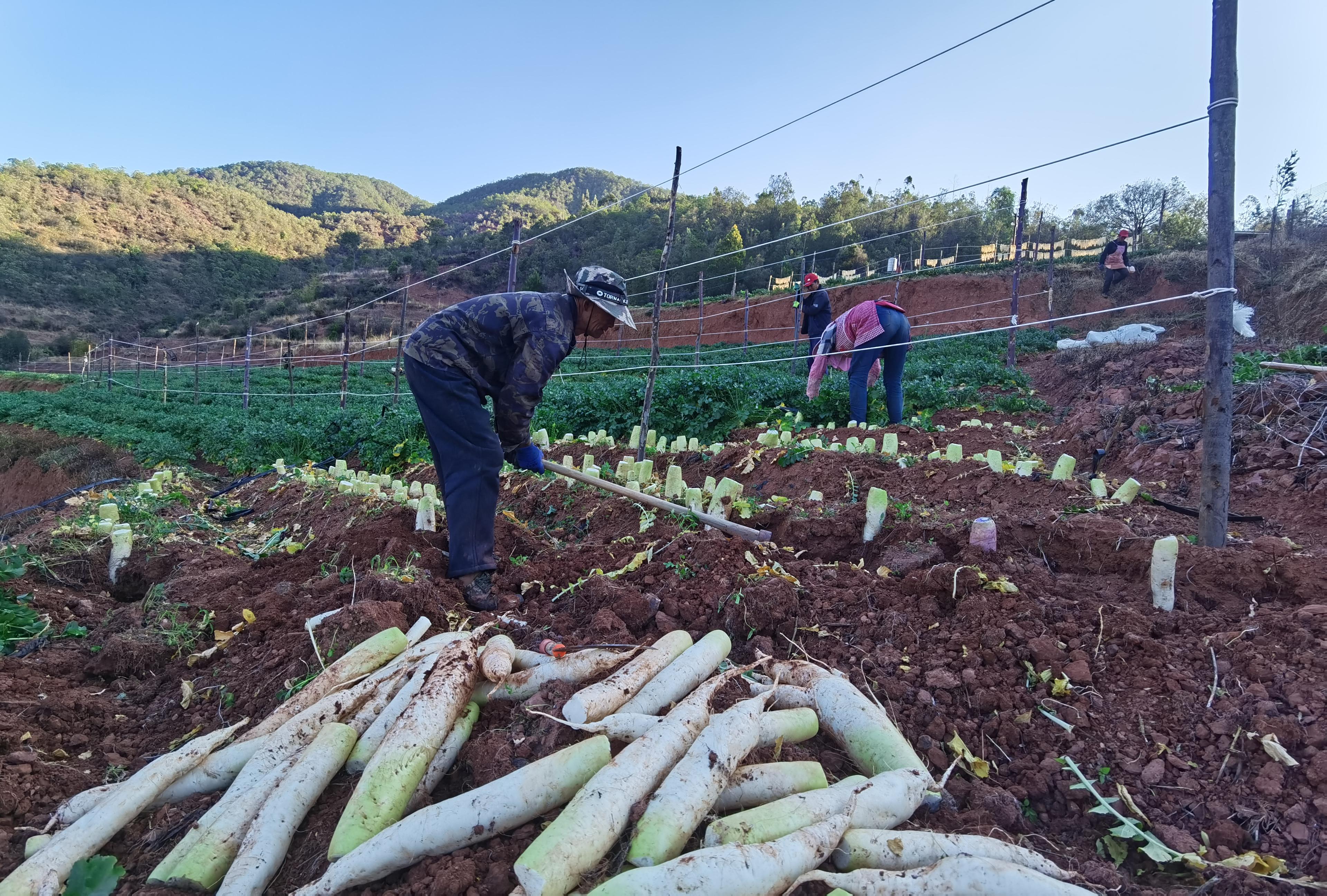 眼下,牟定县蟠猫乡朵苴村委会凹古本村的田间地头处处是村民们挖萝卜、洗萝卜、切条、晾晒的忙碌身影。