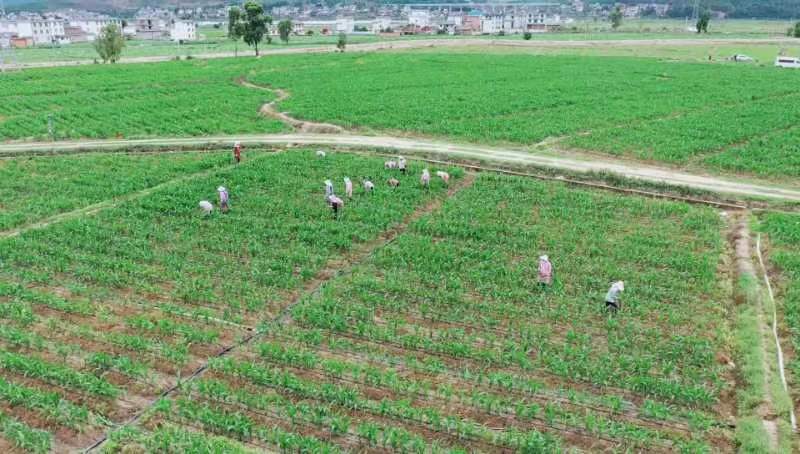 最近几天,牟定县共和镇天台村委会的1500多亩制种玉米进入了间苗时节,种植大户和工人们在田间穿梭,忙着拔掉多余的玉米苗,田间地头一片生机勃勃的景象。