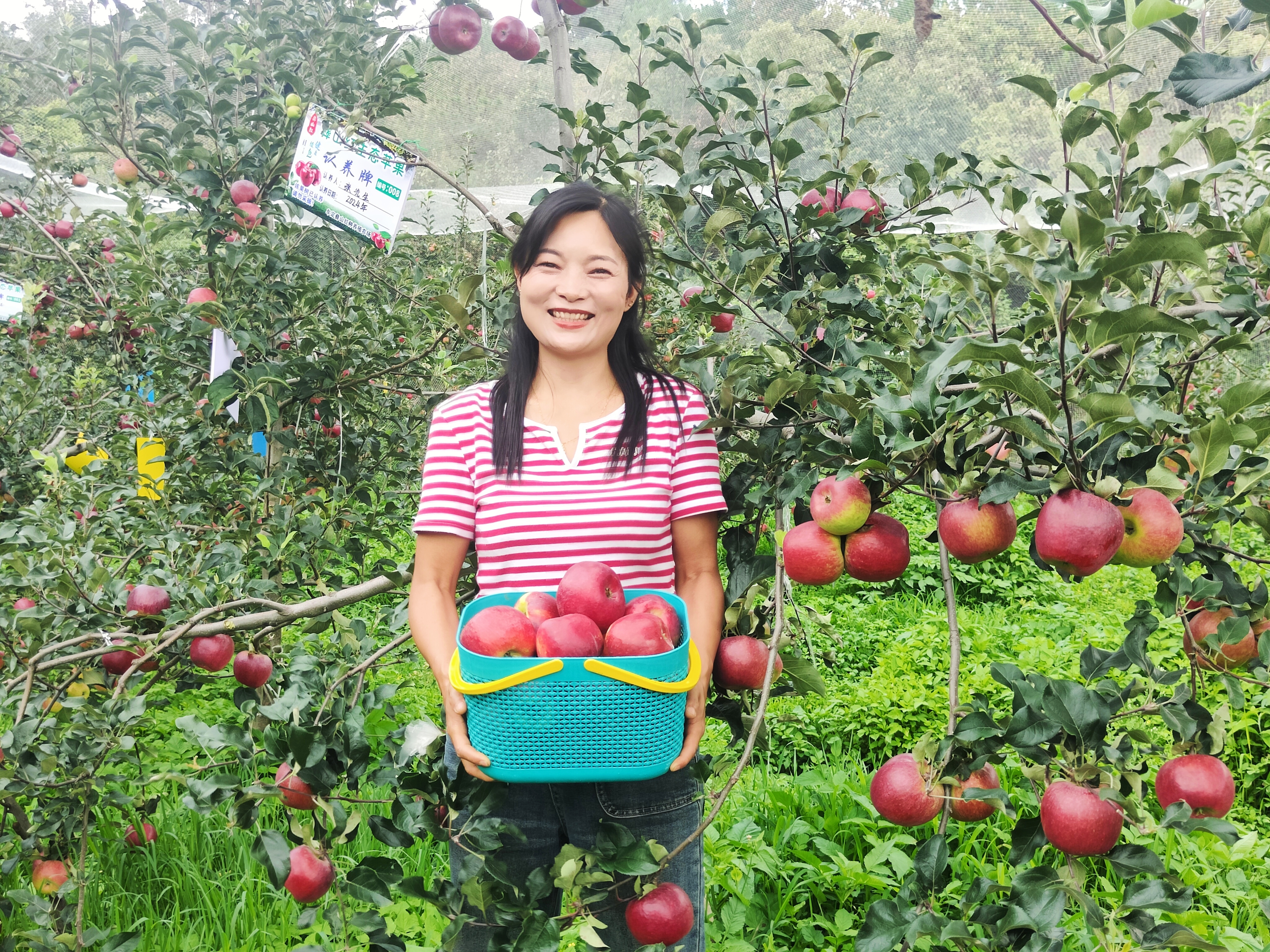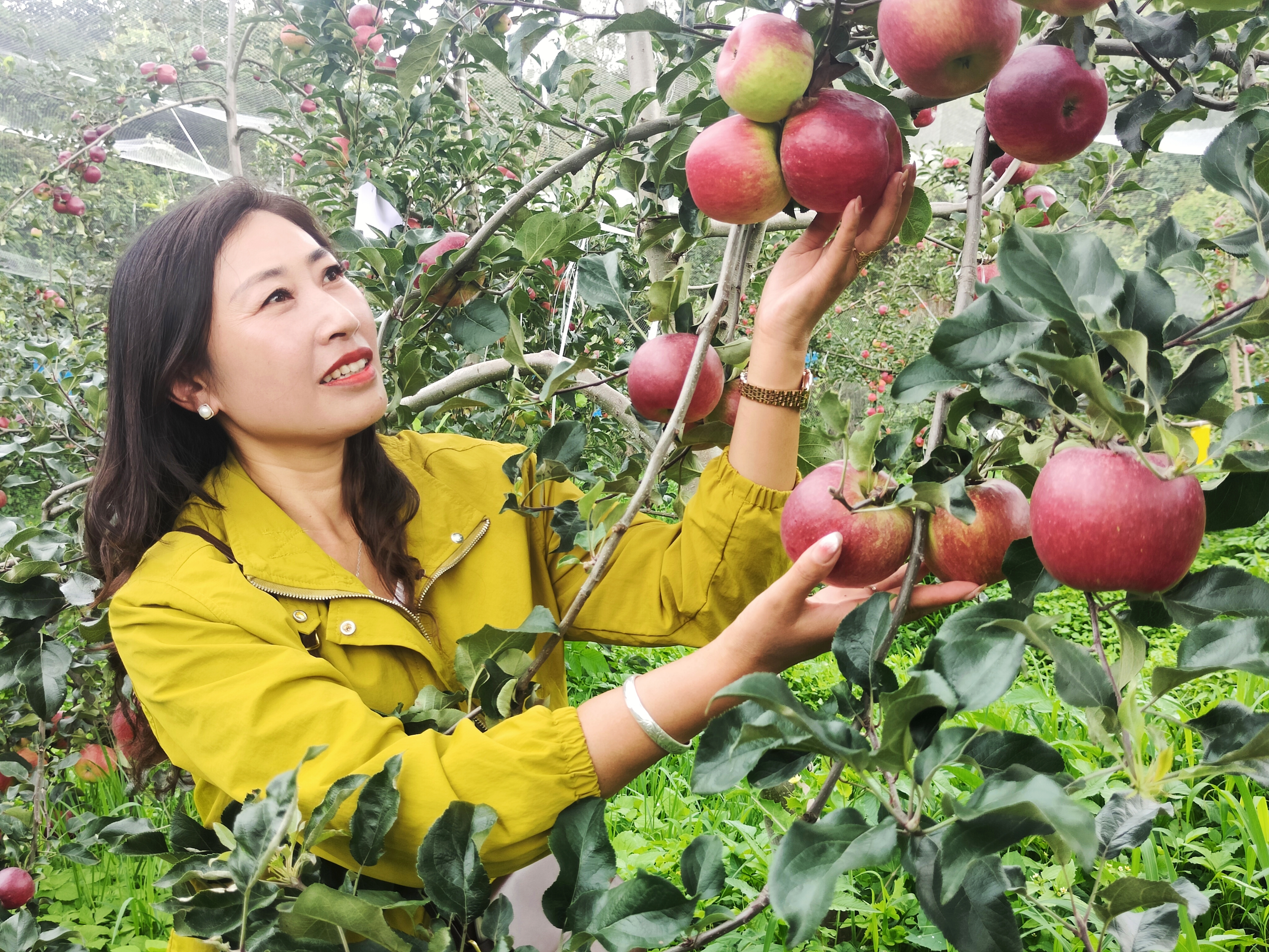 “第一次带着娃娃来这个苹果园摘苹果,又甜又脆又水,口感特别好。”前来采摘的游客董丽琼说。