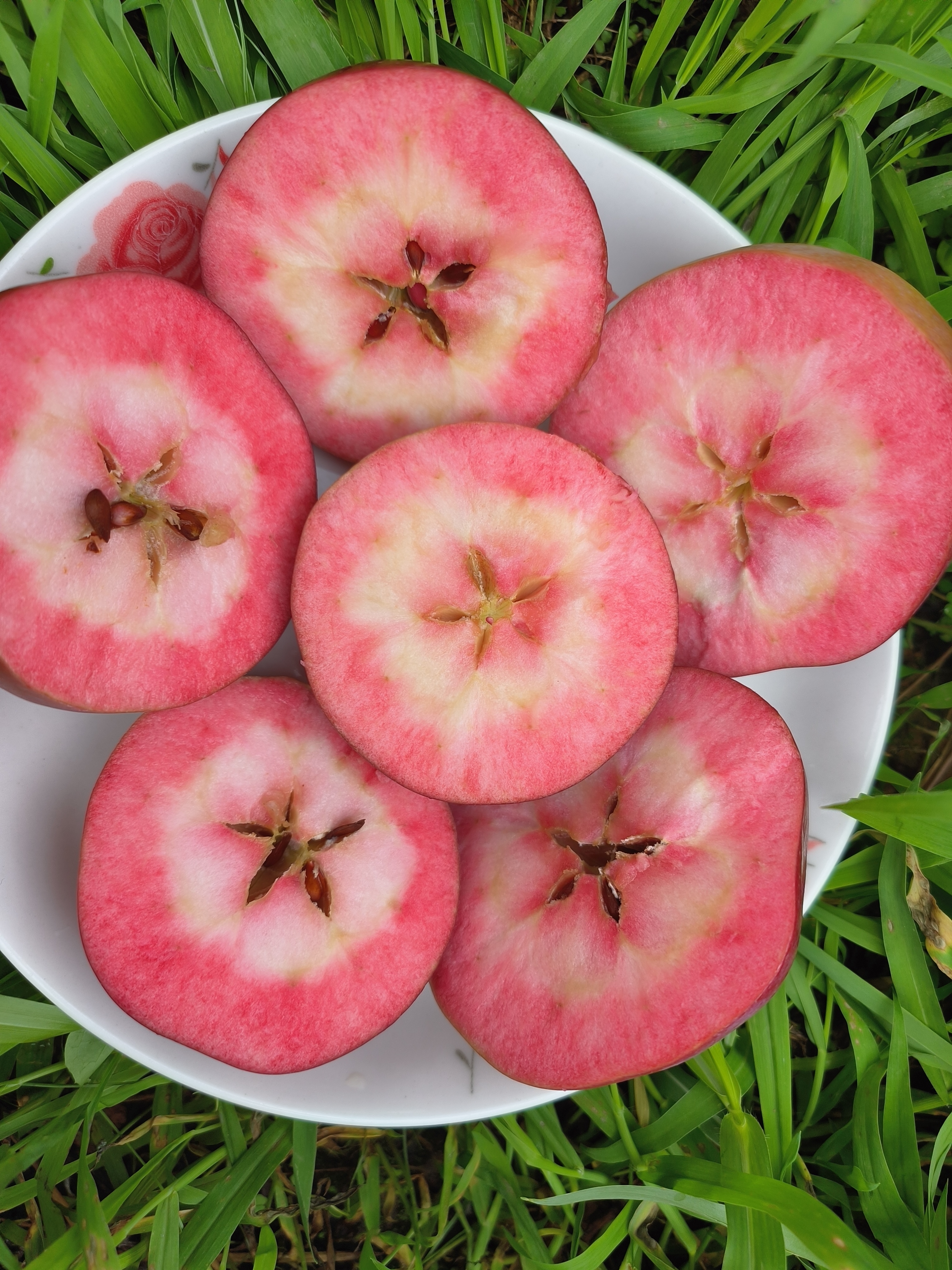 “红色之爱,比较漂亮,果肉是红色的,中间是一朵花型,它是云南省农科院的一个专家从山东引进的品种,这个品种市场比较稀缺,在山东它的市场价是每公斤180元,差不多10月中旬成熟,成熟之后都是供给大型餐厅,糕点店使用。”牟定彝山红种养殖农场负责人刘颖向记者介绍。