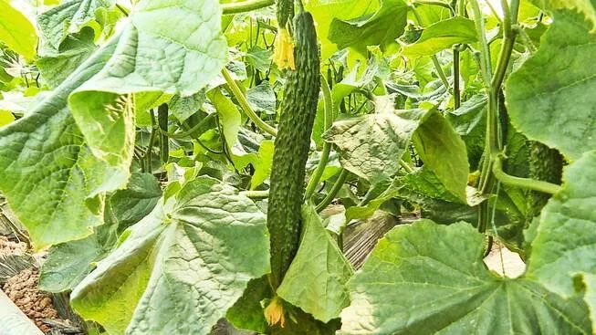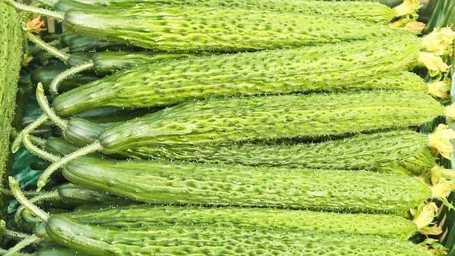 走进共和镇代冲村委会大棚蔬菜基地,73亩黄瓜藤蔓攀爬成荫,翠绿的黄瓜垂挂如帘,细看黄瓜表皮青翠油亮,布满细密的白色小刺,顶端的黄花尚未完全凋谢,映衬得瓜身更显青翠。