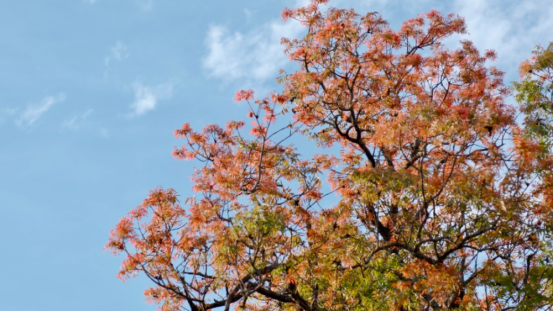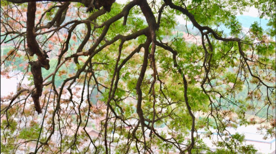 走进老豆冲村,你会被宛如一把大绿伞的黄连木深深吸引,枝叶繁茂而秀丽,呈翠绿色和橙红色;鳞片状的树皮,烙下深深的岁月印记;枝干旁斜逸出,造型苍劲多姿,从不同角度观赏都会呈现出不同的美。
