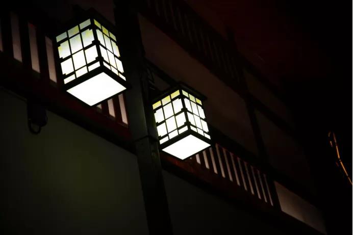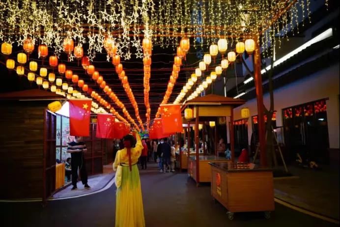晴天的夜晚会有小小的热闹,那是另一番雅趣。街道上空横挂着一行行红的黄的灯笼,往前走一段,挂的又是璀璨的细碎灯带,再往前走,又是红红黄黄的灯笼,造出一方又古又亮的天空。