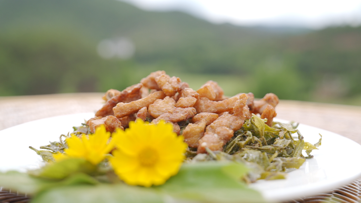 在牟定有一道风味独特的茶菜,来吃出一抹茶香,这道菜名字叫“庆丰茶叶肉”。庆丰茶叶肉选用高山生态优质新鲜采摘的茶叶嫩叶,经过筛选,用甘甜的山泉水进行泡洗,精选新鲜五花肉切片,下油,先放入茶叶至油汤色金黄,捞起茶叶,再放入五花肉炸至肉质金黄,即可捞起上桌。