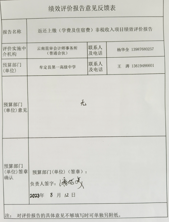 2022年牟定县第一高级中学“返还上缴(学费及住宿费)