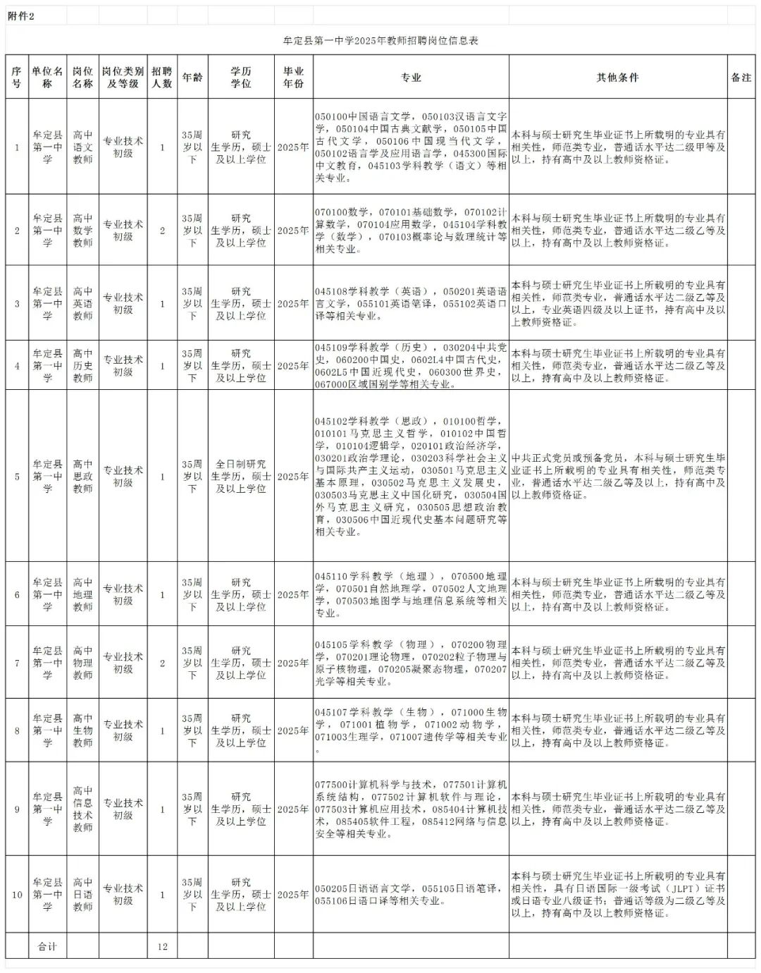 (四)年龄在35周岁及以下(1990年3月1日以后出生),普通高等学校2025届硕士研究生及以上学历,师范类专业(日语学科教师可以为非师范类专业),高级中学相应学科教师资格证,普通话水平须达到二级乙等及以上(语文学科教师须达到二级甲等及以上);