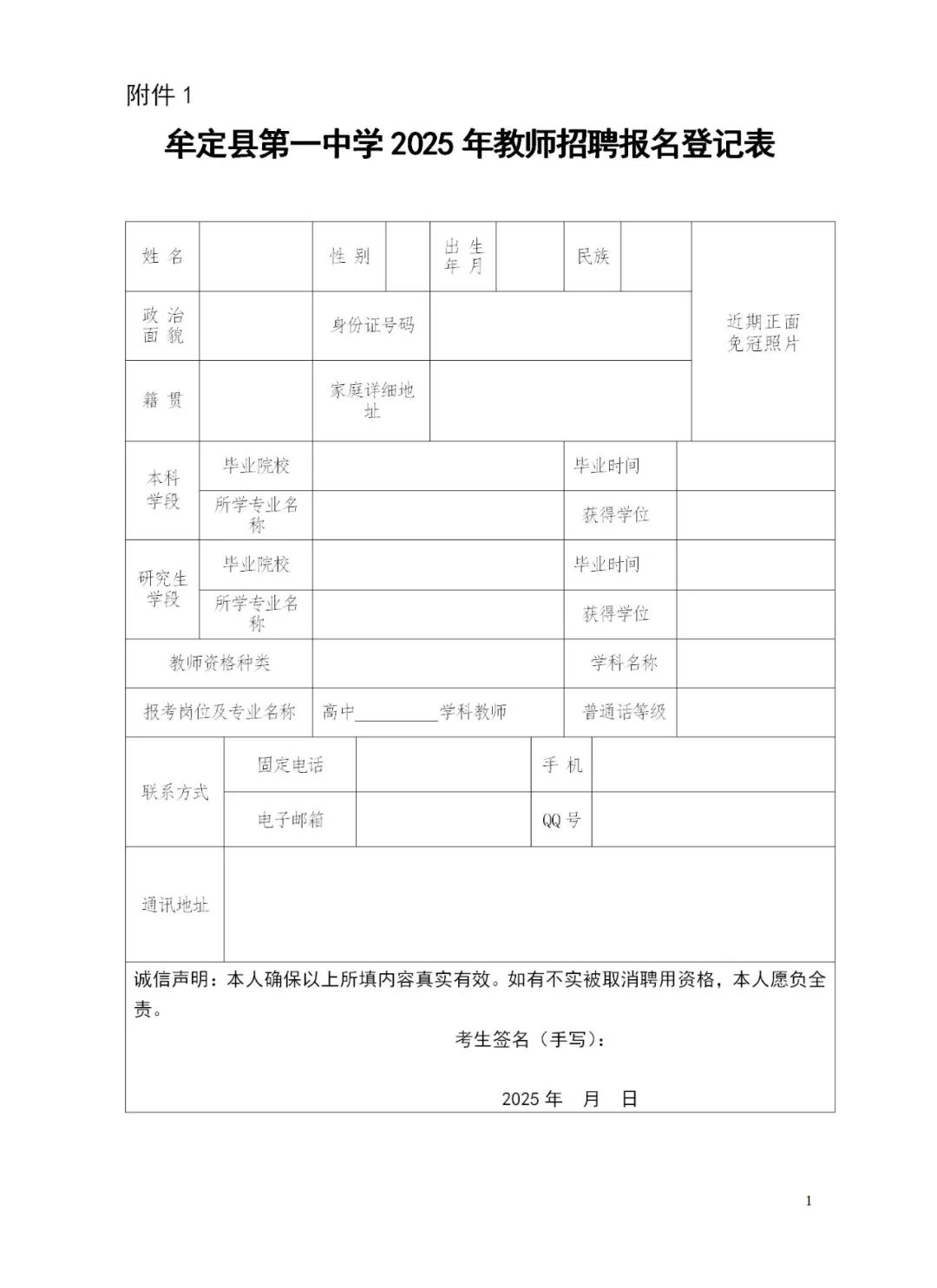 附件:1.牟定县第一中学2025年教师招聘报名登记表