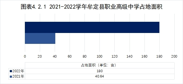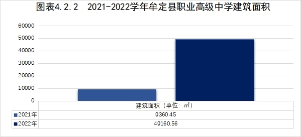 4.2地方政策落实中共牟定县委、牟定县人民政府高度重视职业教育,在左脚舞山城规划区内选址新建牟定县职业教育中心。项目于2016年9月筹建,2017年9月开工建设。项目占地180亩,建设规模总建筑面积4.99万平方(其中,教学楼两幢,共计8700平方米,规划60个教室;学生公寓两幢共计11748平方米,规划住宿1500人;学生食堂3954平方米,可容纳2000人就餐;汽修实训车间两幢,共计2062平方米,可同时满足校内实训及对外经营;图书馆一幢,共计3629平方米;建筑工程实训楼一幢,共计4327平方米;公共实训楼一幢,5377平方米;培训中心一幢,2960平方米;配有标准体育运动场地及相关配套实施),项目总投资2.16亿元。该项目于2022年8月建成投入使用,学校现已迁入牟定县职业教育中心,学校迁入后,满足现有办学规模同时,牟定县职业教育中心还能额外满足1500人技能培训、就餐,1000人住宿。新建校区设施完备,极大改善了教育教学环境。