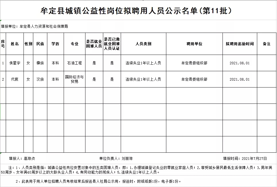 附:牟定县城镇公益性岗位拟聘用人员名单公示(2021年第11批)