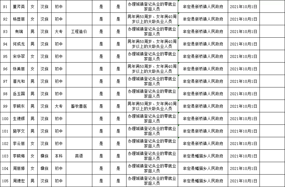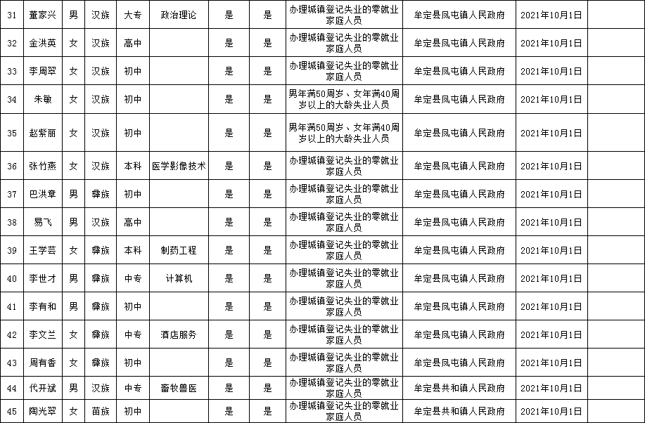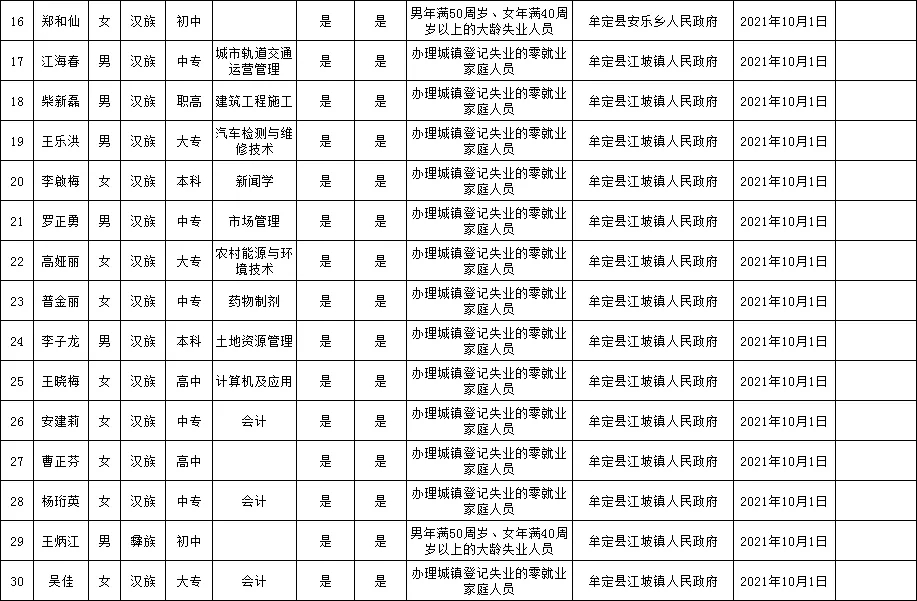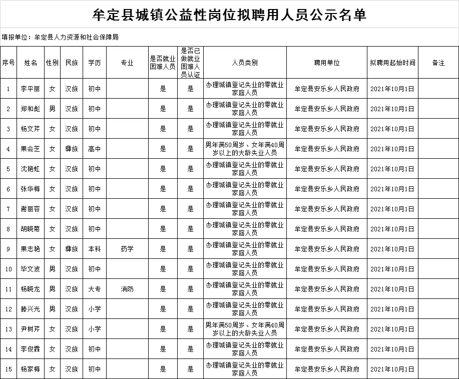 附:牟定县城镇公益性岗位拟聘用人员名单公示(2021年第14批)