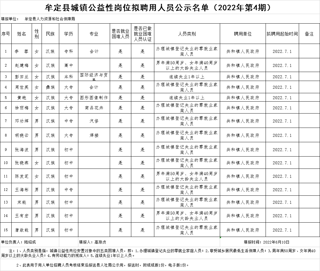 附:牟定县城镇公益性岗位拟聘用人员名单公示(2022年第4期)