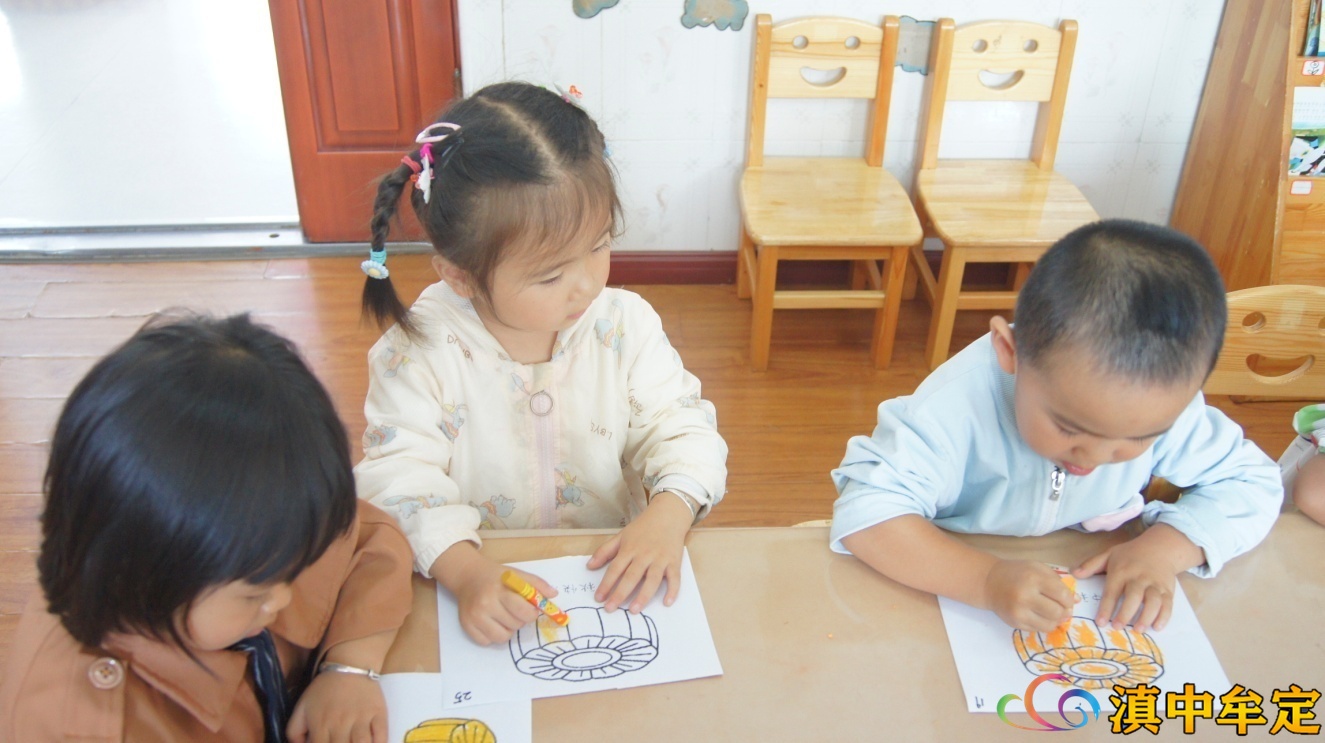 小班的孩子则在老师准备好的画纸上给月饼涂上喜欢的颜色,并把这份甜蜜礼物带回家送给家人。
