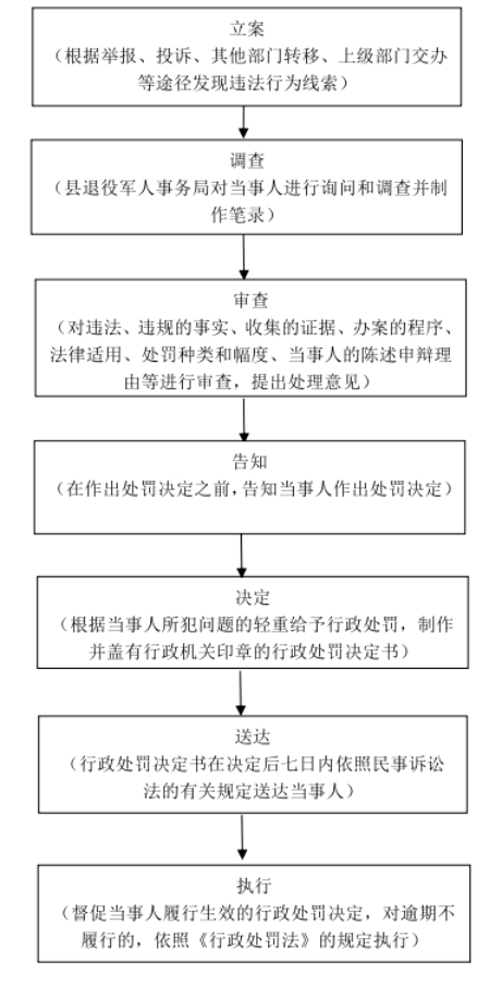 1、对案件初审核查;2、符合条件后立案处理;3、依法调查取证,制作询问笔录、写调查报告、完成审核;4、进行告知,包括告知陈述、申辩权,听证权;5、存在问题的,制作《行政(当场)处罚决定书(单位)》或《行政(当场)处罚决定书(个人)》,当场交付负责人;6、由当地人民政府退役军人工作主管部门责令限期改正;逾期不改正的,予以通报批评,并对负有责任的领导人员和直接责任人员依法给予处分;7、结案归档。